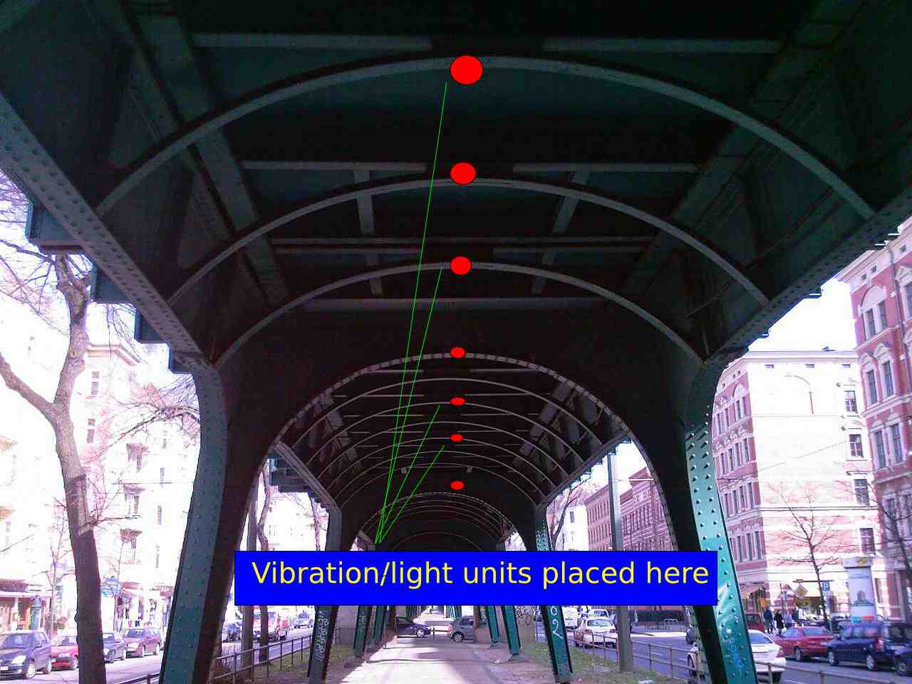 | The underside of bridges are mostly neglected forgotten dark spaces. Train bridge traffic produces useful vibration. This vibration can be used to create a fluid light installation. | ||||||||||||||||||