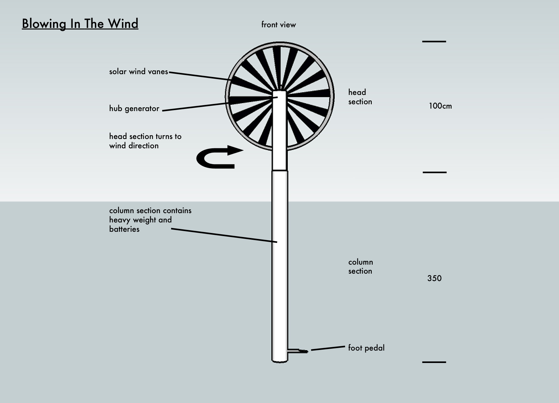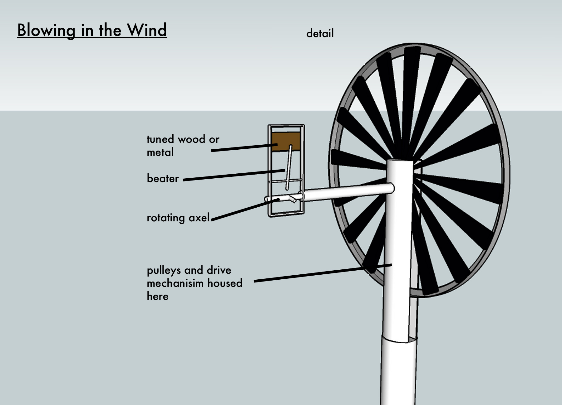 Proposal for Metamatic Research Initiative concept : To realise a new kinetic sound & light work, autonomous & unplugged, generating a composition that is created by a combination of factors. materials : Using a simple bicycle hub generator, flexible solar panels and gravity driven mechanical sound generators, 'klappoteks'- Sixteen 3.50m tall poles with bicycle wheels on top are arranged in a 9 mtr diameter circle. Each unit is divided into column and head section apart from the resulting tone that they make they are identical. When wind blows the wheels turn and charge batteries stored in the column of the unit. When sun shines the solar panel plus wind vanes charge the batteries. At night the work is illuminated by a light composition. Foot pedal located at the base of each column is used to engage the sound mechanism. The pedal is 'pumped' and in turn raises a weight located inside the column. The weight then is released in turn driving a pulley system which engages the mechanical sound generators. All mechanics are hidden inside the column and head sections to protect from weather. The composition is affected by the following factors. Firstly the sound generators are individually tuned by us. Secondly the user, how high they pump the weight and which unit or units they select. Thirdly the weather conditions. Lastly a communication system will be implemented between the units. Based on a laser and sensor combination that measures the acoustic activity of its neighbour. It will generate a sense of harmony and organisation that in time influences the sonic experience. The composition principles could be best compared to the flocking behaviour animals such as birds and fish exhibit when moving in groups. When the installation is passive it just generates electricity. When activated by physical labor it creates differing rhythmical and a-rhythmical sounds that then can be tuned by participant giving unlimited possibilities. This is just a proposal for a new work. Meaning its final shape will be defined by the creative process when building it. |